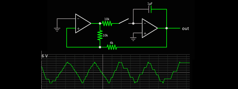 If we want to automate this, we need an analogue switch. Transistors can be fiddly and the common CD4066 won’t process all signals, so I used a DG201. This switch is ‘normally closed’, so with no gate on the command input, drain and source are connected and the integrator’s loop is closed. Pulsing it breaks the connection.